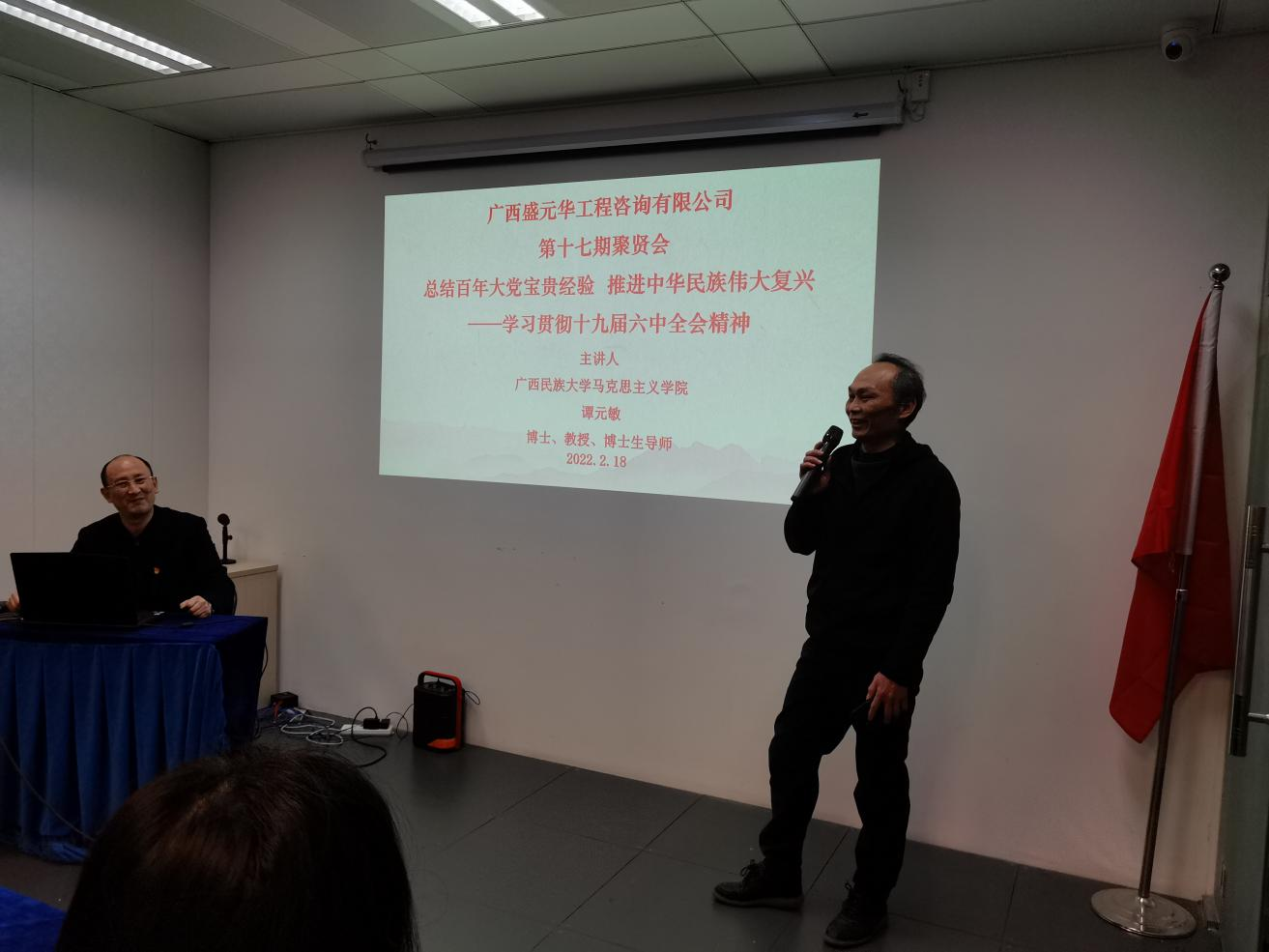 為豐富公司的黨建工作及企業文化建設,公司于2月18日下午在總部會議室成功舉辦了第十七期期“聚賢會”互動交流講堂活動。本次“聚賢會”是以黨課的形式開展學習十九屆六中全會精神的講堂活動,主題為“總結百年大黨寶貴經驗、推進中華民族偉大復興,解讀十九屆六中全會精神”。 本期活動邀請到的是廣西民族大學譚元敏教授蒞臨我公司授課,他用生動的語言、精彩的PPT演示,使“聚友”們對黨的十九屆六中全會精神有了更深刻的理解。
