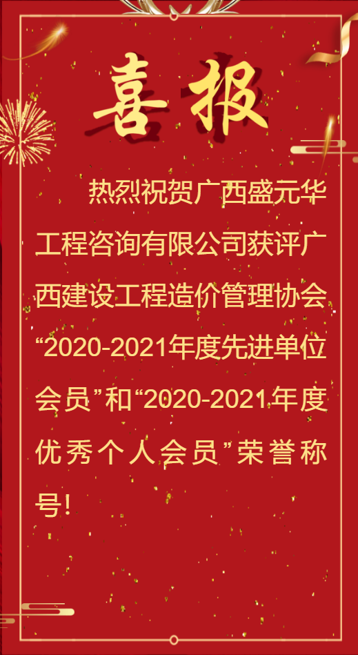 | 【喜訊】熱烈祝賀廣西盛元華獲評廣西建設工程造價管理協會“2020-2021年度先進單位會員、優秀個人會員”兩項榮譽稱號 |