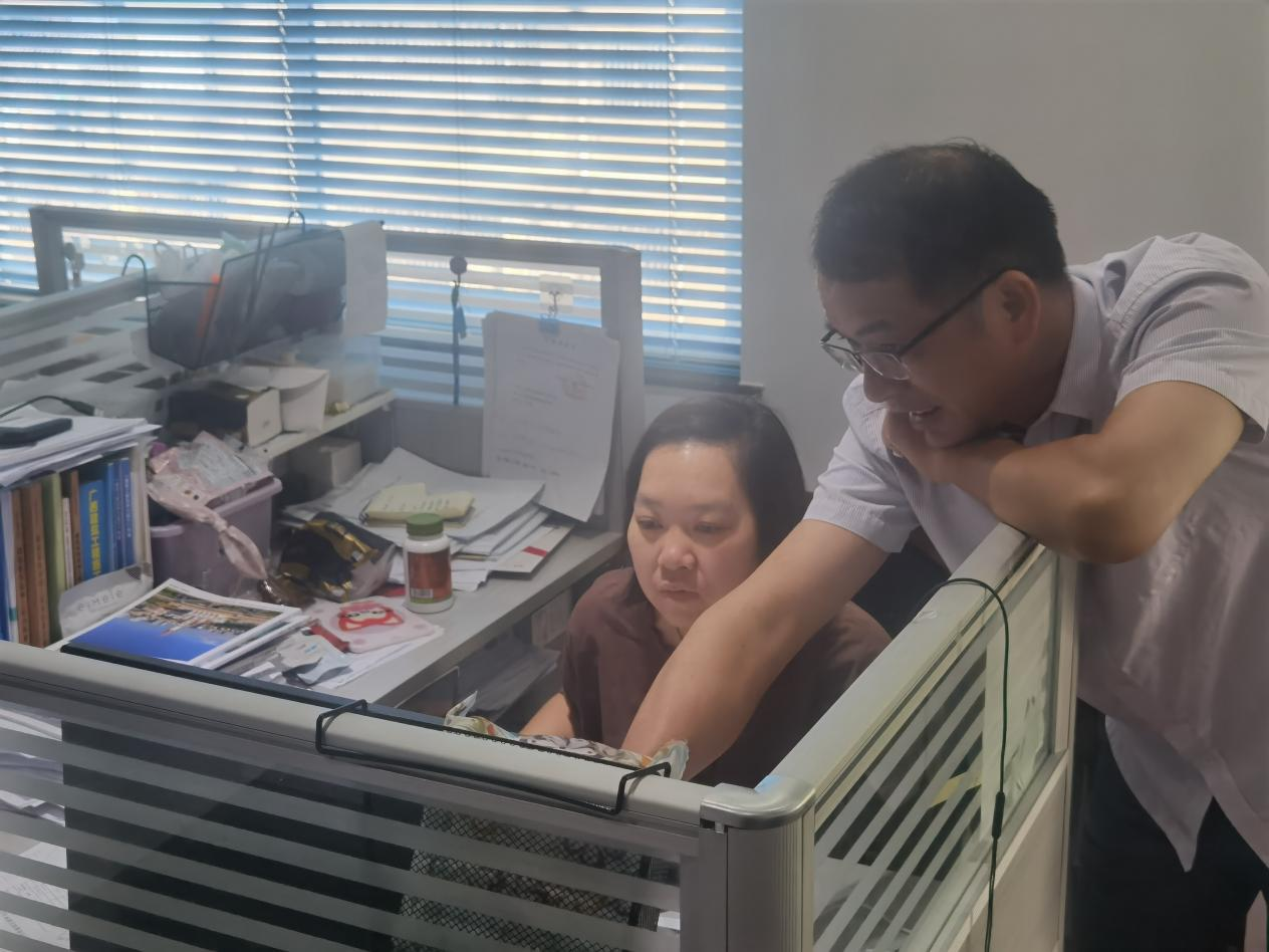 總工辦總工黃群在檢查分公司成果文件并指導業務員規范開展相關工作